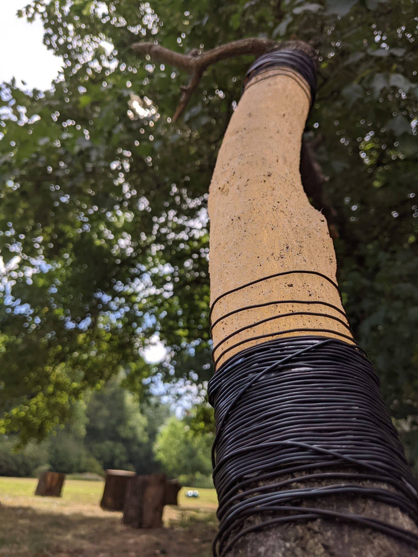L’opera riprende il concetto delle Brecce, dove la fragilità e le lacerazioni diventano occasione di rigenerazione e di bellezza. Qui il legno naturale si intreccia con la materia artificiale, e i due elementi — diversi per natura e consistenza — sono tenuti insieme da una legatura di fil di ferro. Con il tempo, il ferro arrugginisce, assumendo le tonalità del legno, fino a diventare parte integrante dell’opera.