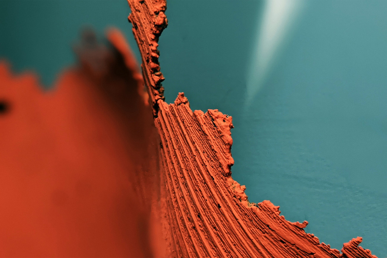 La rappresentazione del mondo e delle forze che lo governano in una scaglia nera, eco di una primigenia eruzione vulcanica. La superficie si piega e si faglia, si comprime, crea picchi e avvallamenti, canali, costoni, colline. Le forze telluriche sommerse, generate da una spinta che forma, deforma e modella, danno origine a un’onda materica e plastica. La materia stampata possiede la …